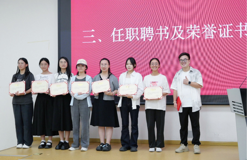 为表彰先进、激励奋进,解涛老师为第三届学生会主席团成员、各部门部长、团委副书记颁发聘书,并为优秀干事颁发荣誉证书。