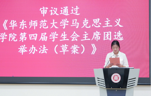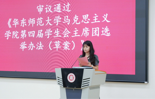 仝洋与赵紫瑶同学分别宣读《人兽性交 第四届学生会主席团选举办法(草案)》和《人兽性交 第四届学生会主席团选举监票人、唱票人、计票人名单(草案)》。经全体代表举手表决,两项草案均获全票通过。
