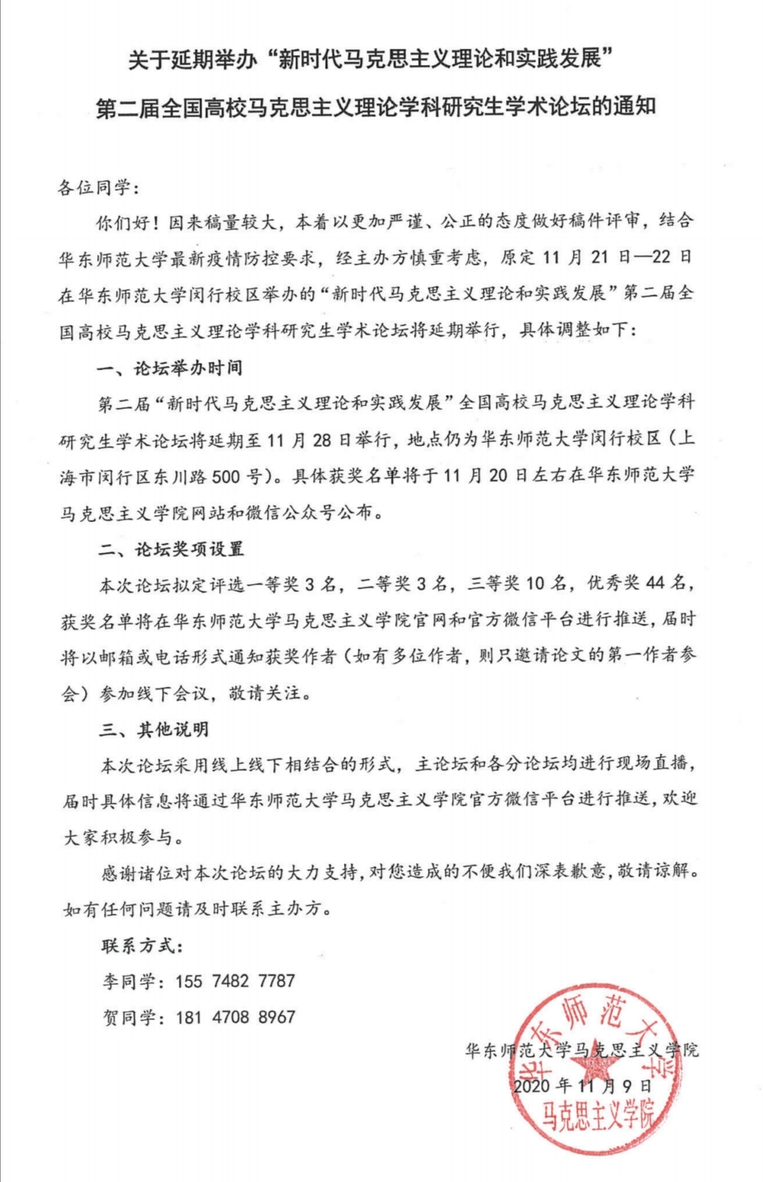 第二届“新时代马克思主义理论和实践发展”全国高校马克思主义理论学科研究生学术论坛将延期至11月28日举行,地点仍为人兽性交 闵行校区(上海市闵行区东川路500号)。具体获奖名单将于11月20日左右在人兽性交 网站和微信公众号公布。
