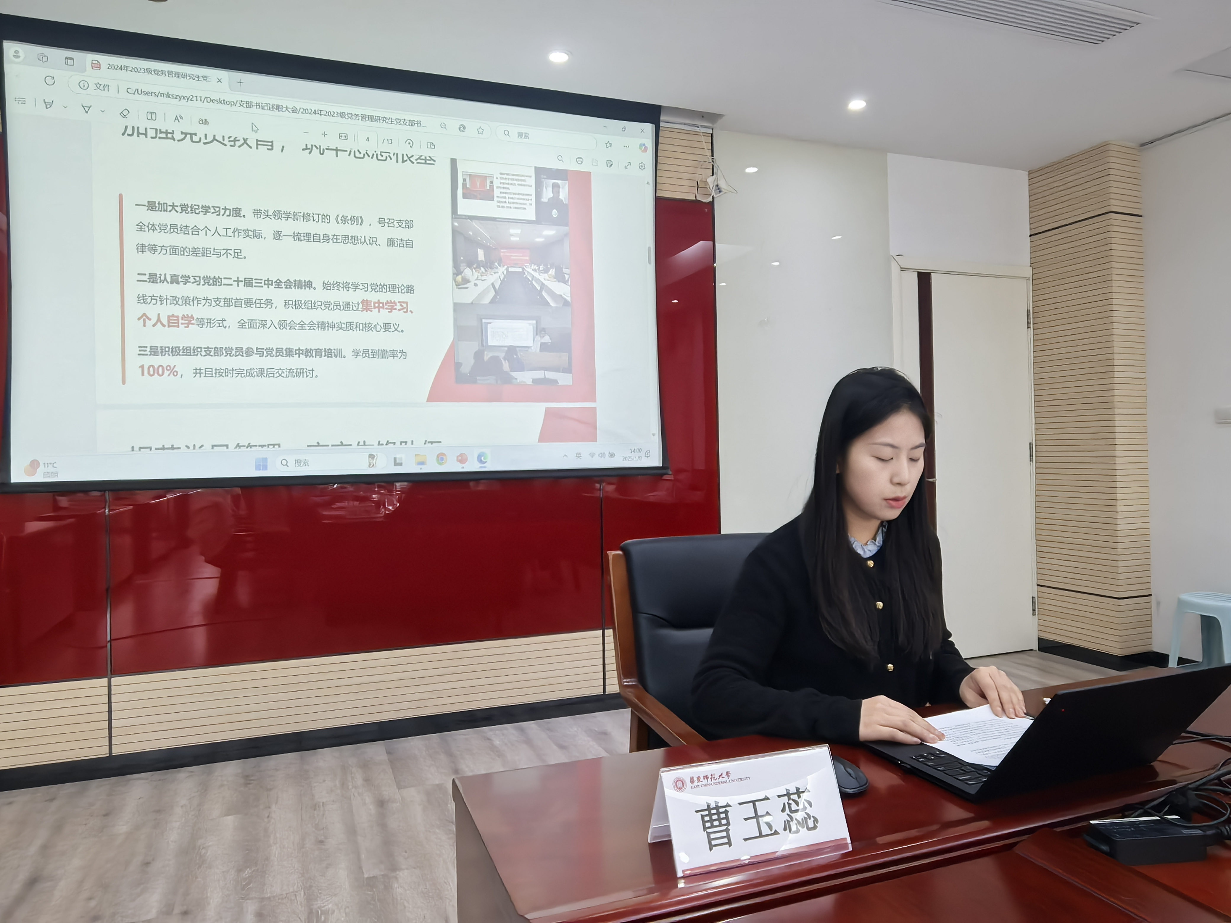 随后,2023级党务管理研究生党支部书记曹玉蕊梳理了支部充分使用红色场馆资源组织学习等活动特色,认真查摆存在的不足和进一步的优化思路。中共党史党建系研究生党支部书记薛千慧汇报了支部成员开展志愿宣讲服务等工作亮点,结合自身工作实际剖析了当前的问题和改进的举措。学院副院长蒲妍和许瑞芳依次对应点评,肯定各学生支部建设成绩,同时围绕短板提出针对性建议。她们强调指出,支部活动要增强吸引力与实效性,注重支部建设与学生实际深度融合,助力学生学术提升与工作就业,创新活动形式与宣传方式,加强支部间活动的交流协同。